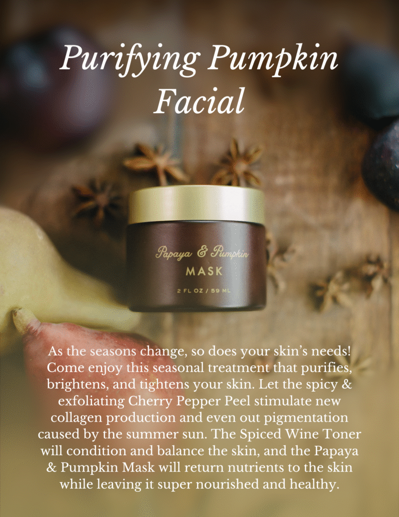 Our Pumpkin & Papaya mask feels warm on the skin and will put you into fall heaven with its nostalgic aroma of a fresh pumpkin pie. This facial uses the natural properties of pumpkin (Vitamin A & Vitamin C) to brighten, remove impurities, hydrate, and improve the skin’s texture.