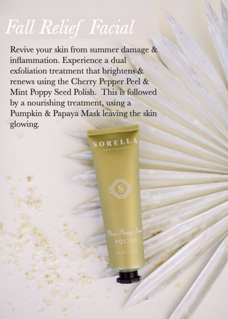 Transition your skin into the new season with out Autumn Reset Facial featuring Sorella Apothecary’s intentional botanicals. This rejuvenating treatment helps repair summer damage, deeply hydrates, and prepares your complexion for cooler weather ahead. Reveal refreshed, radiant skin that’s ready for fall.